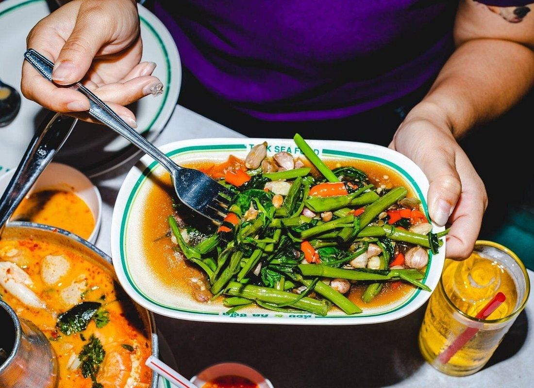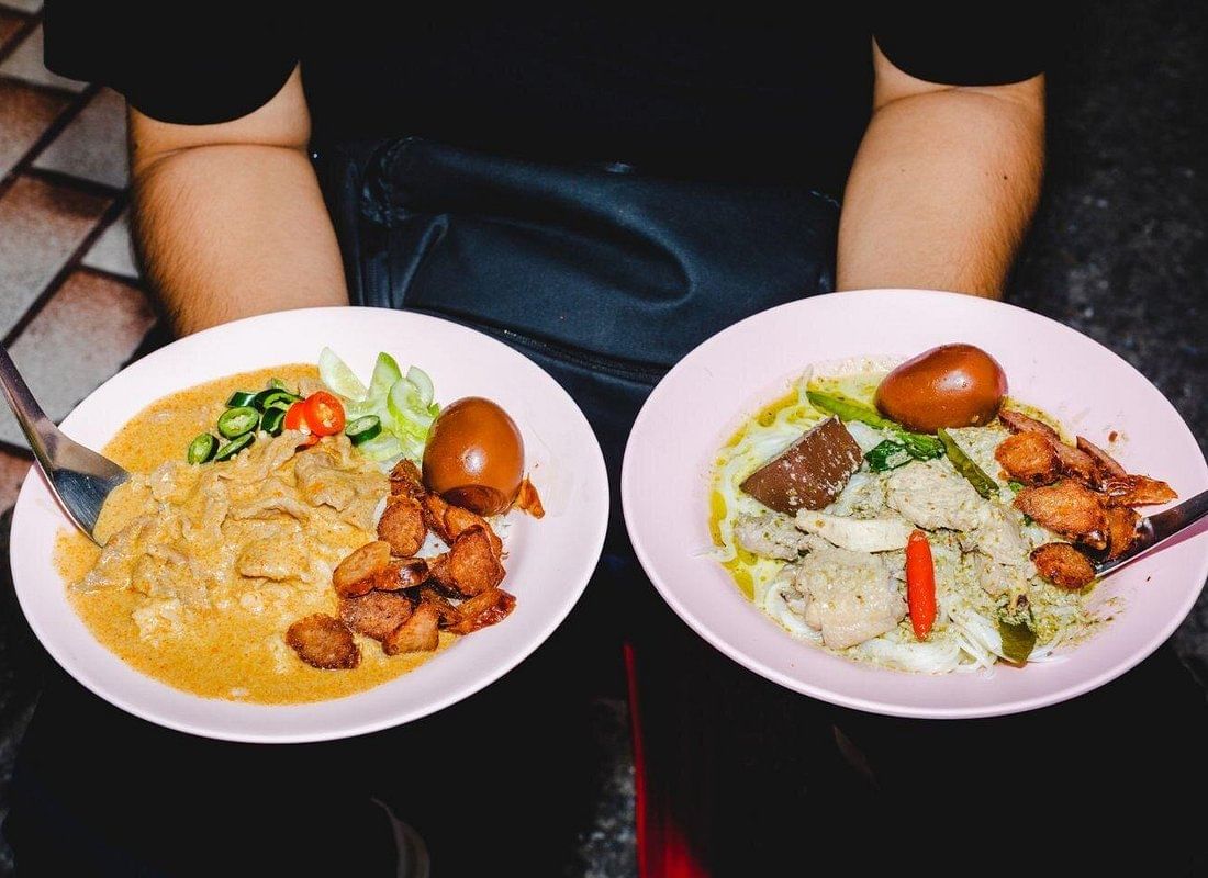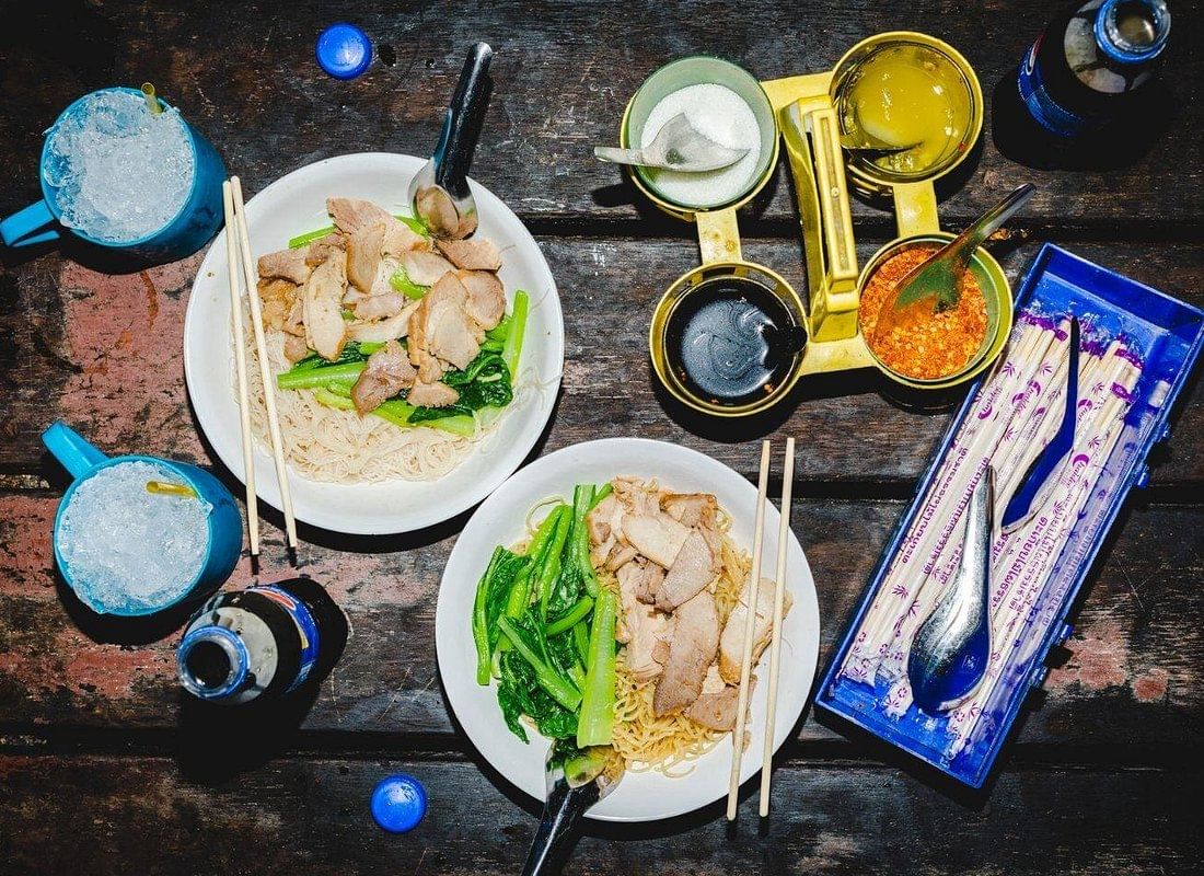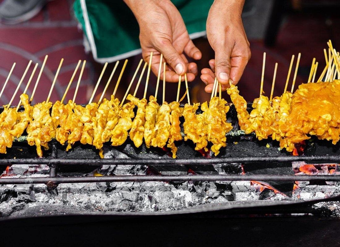 - Sample foods such as Thai curry, chicken satay, and noodles