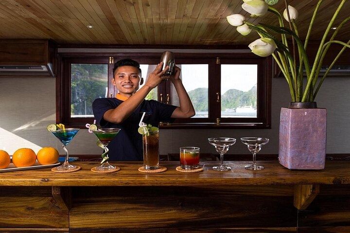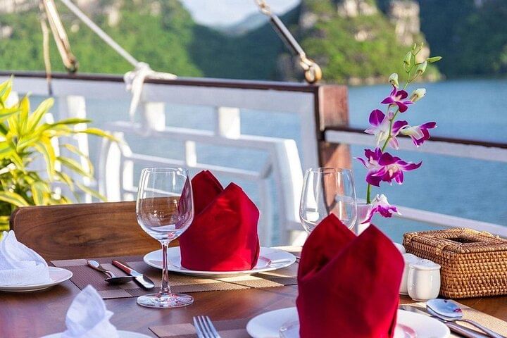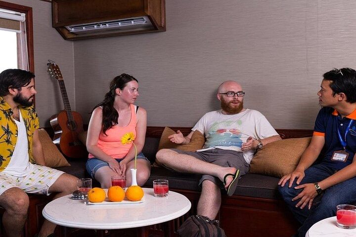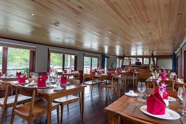 Enjoy a premium small-group journey designed for comfort, exclusivity, and authentic discovery. With a maximum of 20 guests on board, you’ll receive personalized attention throughout the trip—each group traveling in a luxury minivan or limousine accompanied by a professional tour guide. Begin your adventure in a private waiting lounge before embarking on a 7.5-hour cruise that takes you deeper into the hidden corners of Halong Bay. Enrich your understanding of Vietnam’s history, culture, and the daily life of local fishing communities. Relax on the spacious sundeck under warm sunshine or dine in the open-air restaurant while surrounded by breathtaking views.